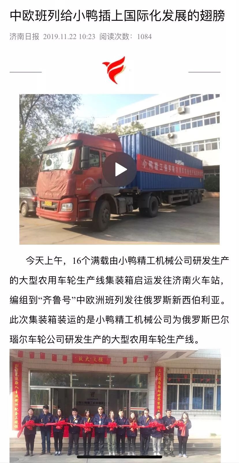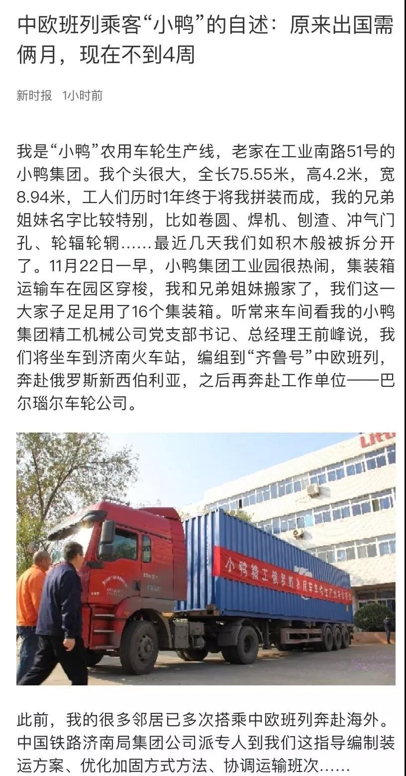 11月22日,小鴨精心烏克蘭農運車汽車輪胎生產線發車開學典禮正式啟動,16個集裝箱將連續發到濟南火車站,編組到"齊魯號"中歐鐵路寄往美國新西伯利亞。