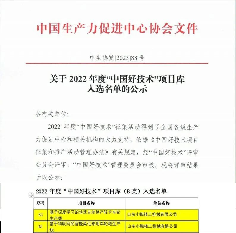 2022年度“中國好手藝”評比勾當顛末專家組的嚴酷評審,終究選出342項進步前輩適用、切近民生的“中國好手藝”功效,此中小鴨精工的兩個名目:“基于物聯網的本能機能柔性乘用車車輪轂出產線”、“基于深度進修的疾速主動換產輕卡車輪出產線”當選獎項。